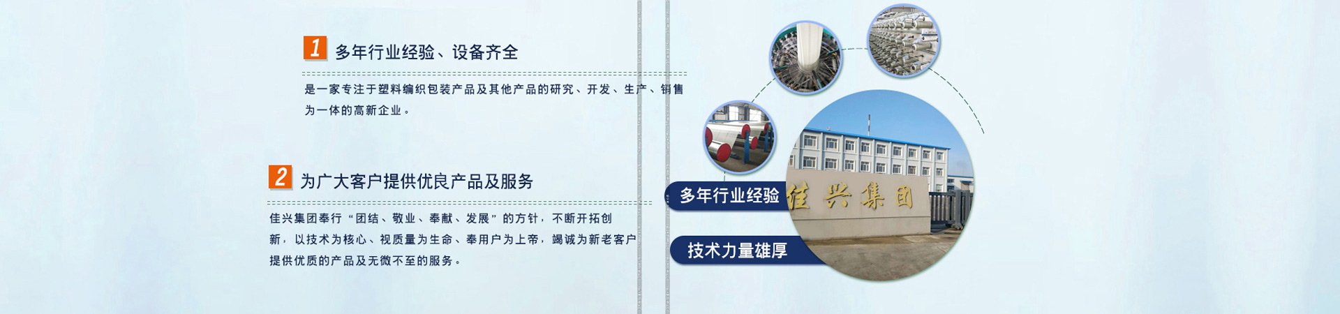 佳木斯市佳興塑業(yè)集團(tuán)有限公司(以下簡稱“佳興集團(tuán)”)成立于2009年,位于佳木斯市高新技術(shù)開發(fā)區(qū)。主要股東:董事長 常邵峰、監(jiān)事 常佳興。公司占地面積94166平方米,注冊資金9800萬元,是佳木斯市政府招商引資項(xiàng)目之一,也是黑龍江省重點(diǎn)企業(yè)。2022 年實(shí)現(xiàn)產(chǎn)值6500余萬 元,營收5840余萬元,利稅589萬元,公司現(xiàn)有職工 196人,其中專業(yè)管理及工程技術(shù)人員 28 余人。 公司2014年通過“ISO9001質(zhì)量管理體系認(rèn)證”和“ISO14001環(huán)境管理體系認(rèn)證”。2015年引進(jìn)先進(jìn)生產(chǎn)線,可實(shí)現(xiàn)年產(chǎn)各種類型塑料編織袋8000萬條。2016年公司獲批食品用塑料包裝容器工具等制品的“